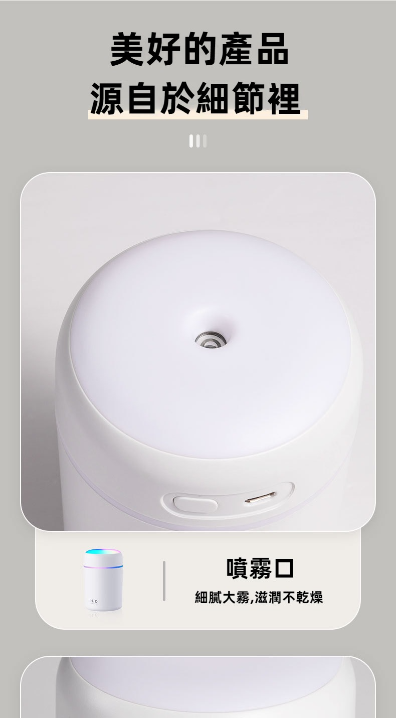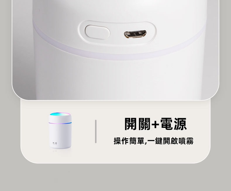 大容量水箱:300ML的水箱容量,提供持久的霧化效果,適用於10平米以下的空間。