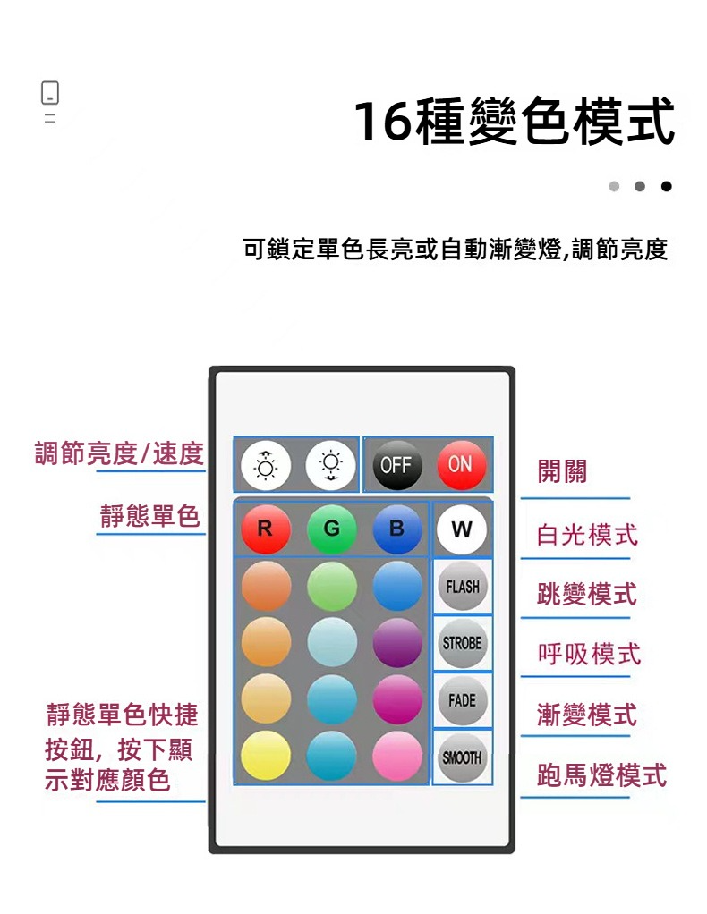 商品貨號:9802D9-5V-5050-RGB-30灯-24键红外-滴胶5米