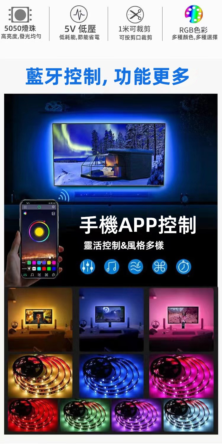 這款LED氣氛燈帶專為營造多元氛圍設計,採用5050高亮LED燈珠,具備RGB全彩顏色,並支持音樂和紅外遙控控制。