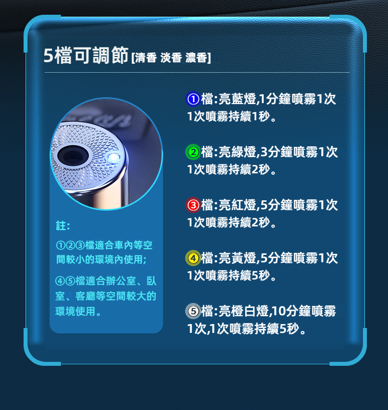 - 5檔可調節,根據個人喜好調整香氣濃度,讓你的行車更加個性化。