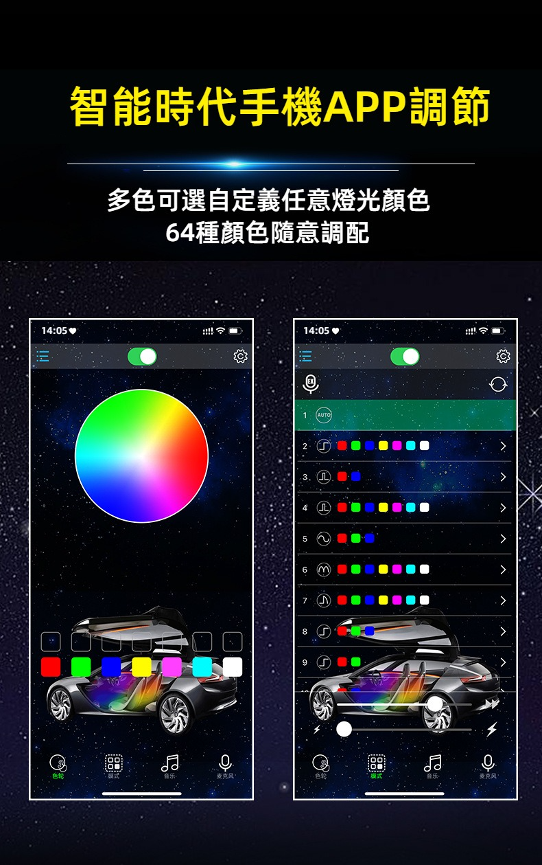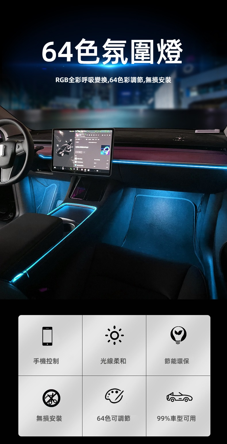 支援 64 色自由調節,燈光隨心切換,多種模式滿足您的駕駛心情。