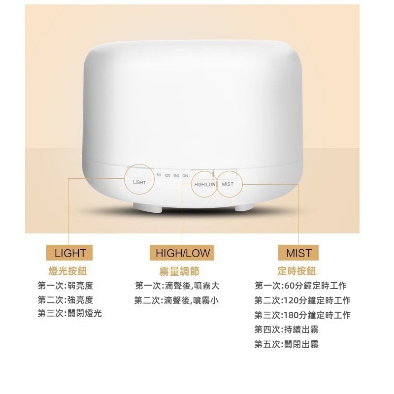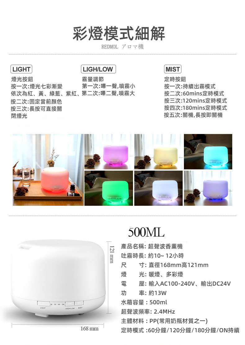 七彩燈香薰加濕器 500毫升超聲波定時擴香機 負離子靜音助眠