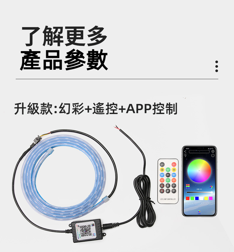 多模式燈效:內建多種燈光效果(流光跑馬、常亮、關閉燈光、呼吸燈等),一鍵切換,打造專屬愛車氛圍。